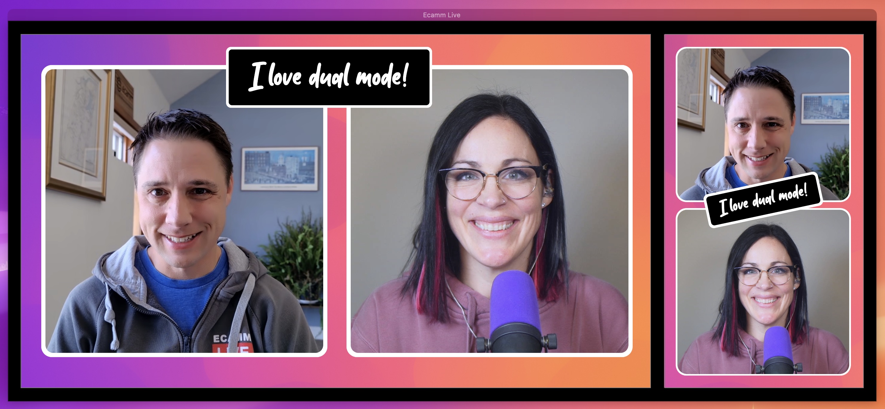 Version 4.5's biggest new feature is Dual Mode. Ecamm scenes can now include both horizontal and vertical layouts. Both layouts are automatically recorded, and can be streamed out to any platform.Ecamm even handles streaming both layouts to YouTube simultaneously. Check out this quick introduction to Dual Mode to start using it today!