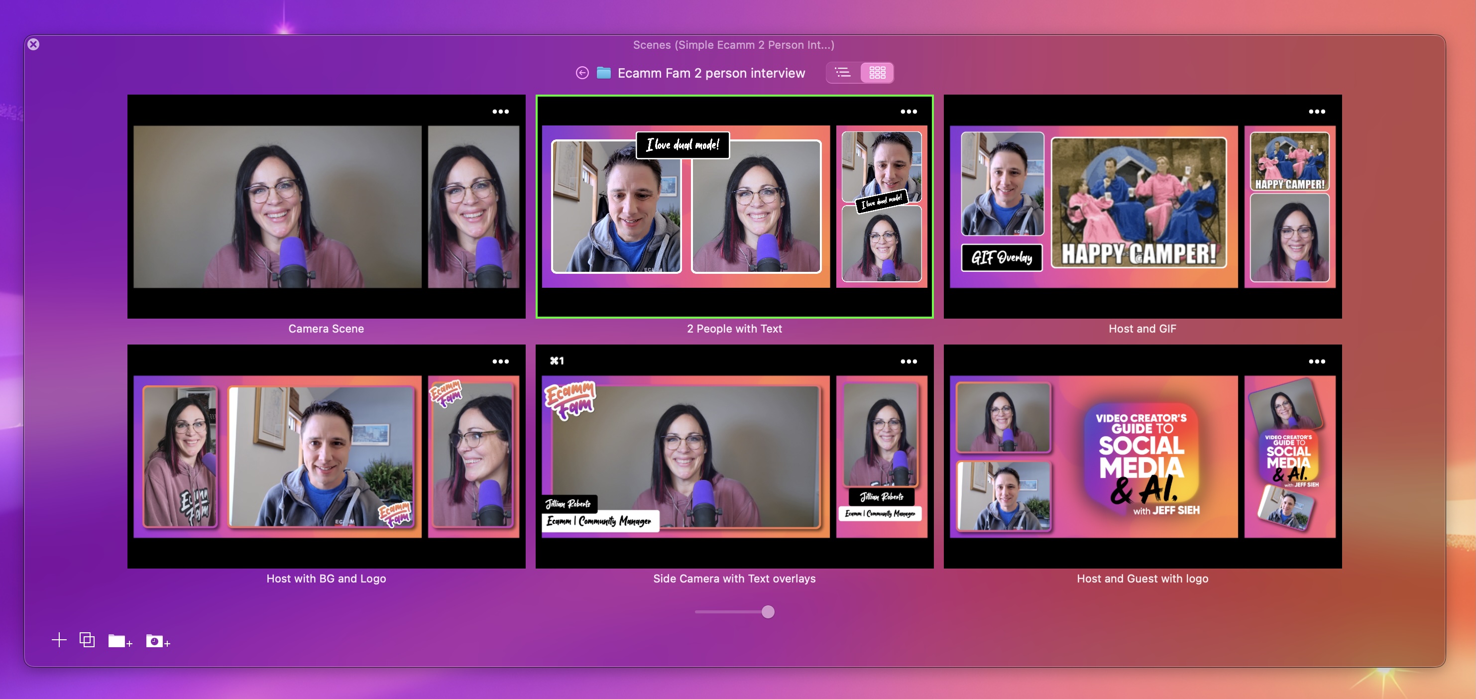We've also added a new way to view and manage your Ecamm Scenes. Use the tiny view buttons at the top of the Scenes window to switch to Grid View and try it out now.